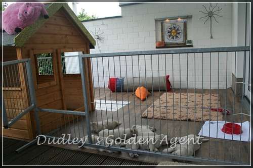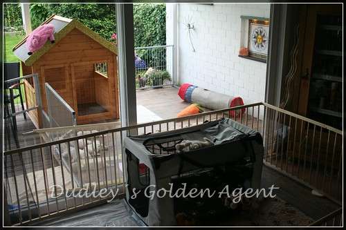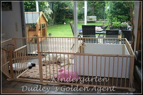 So nun sind wir fast 4 Wochen jung und aus dem Kindergarten ist eine Grundschule geworden. Bei uns sind das die I- Dötze, wenn Kinder eingeschult werden. Die Wurfkiste ist nun ganz weg und wir haben einen Zimmerkennel als Kuschelhöhle. Die Terrasse wurde von uns auch erobert. Es ist spannend in unserem neuen Domizil.