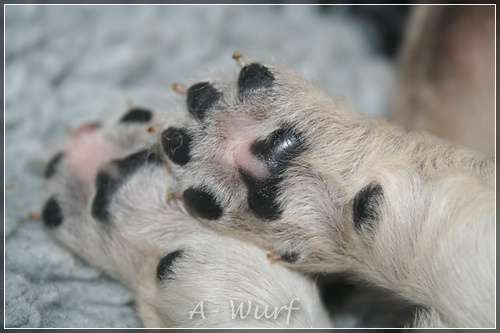 Nun kann man zusehen wie das Pigment sich bildet. Alle Agent´s haben den Schornsteinfeger geküsst. Nase, Mäulchen und Pfötchen dunkeln langsam nach. Bei manchen hängen auch die Ohren schon weich runter, sind wohl doch keine Spitz Hunde geworden 😀 . Penny ist klasse es geht ihr prima.