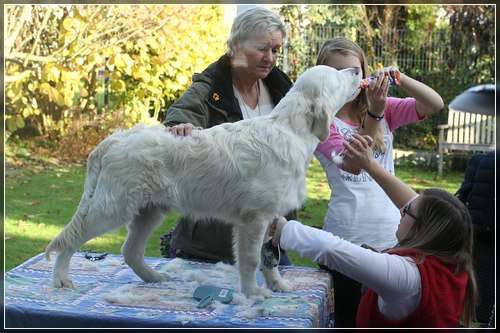 Heute waren Agent Cody mit Fam. und Agent Leroy mit Fam. bei uns. Beide wollen im Dez. ausstellen. Außerdem war ihre Halbschwester Page (of- golden-mountain-lake ) mit Renate dabei. Jessica Tölle, unsere Nichte als Aussteller Profi ;-D übernahm das Training und Trimmen der Agent´s .