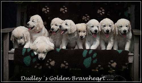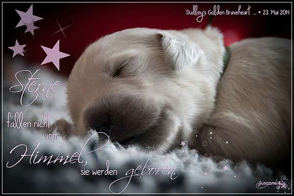 Dudley´s Golden Braveheart …. sind geboren 😀 Am 23.05.2014 hat Penny uns 5 Hündinnen und 4 Rüden geschenkt. Es war der 61. Tag allen geht es super, nur die Zweibeiner schwächeln etwas 🙂