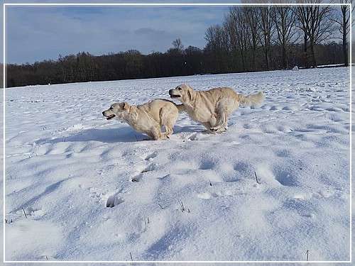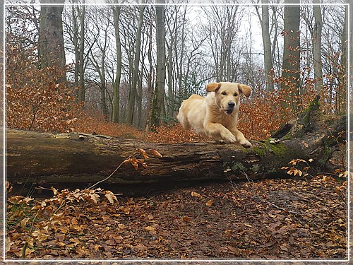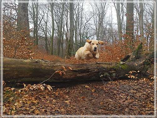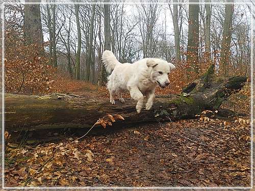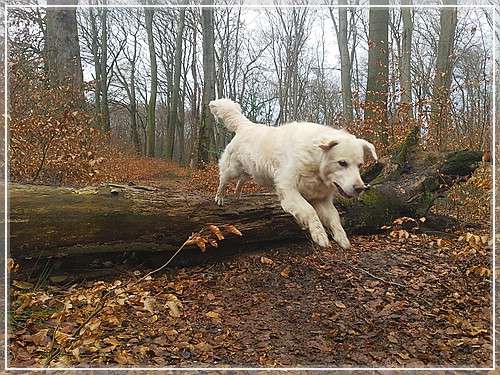 Heute ist Angel mit Oma Penny im Wald unterwegs. Penny mit fast 12 Jahren ist immer noch gut drauf. Wenn Angel über einen querliegenden Baum fliegt versucht Penny es auch, da kann ich nur grinsen.
