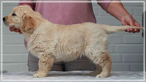 Sehr gut geschnittener Kopf mit korrektem Ausdruck, korrekt gelagerte Schulter u. Oberarmlänge, gerade Oberlinie, korrekte Brusttiefe, korrekte Winkelungen, sehr gute Knochensubstanz, bewegt sich gut.
